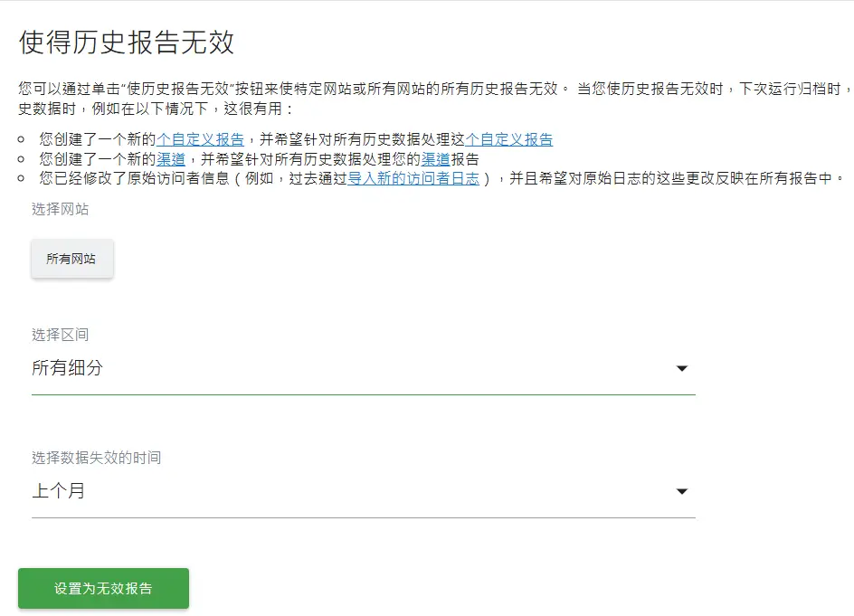 然后到 Matomo 统计的设置>系统>设置为无效报告里把从上个月开始的数据设置为无效(根据需要调整)